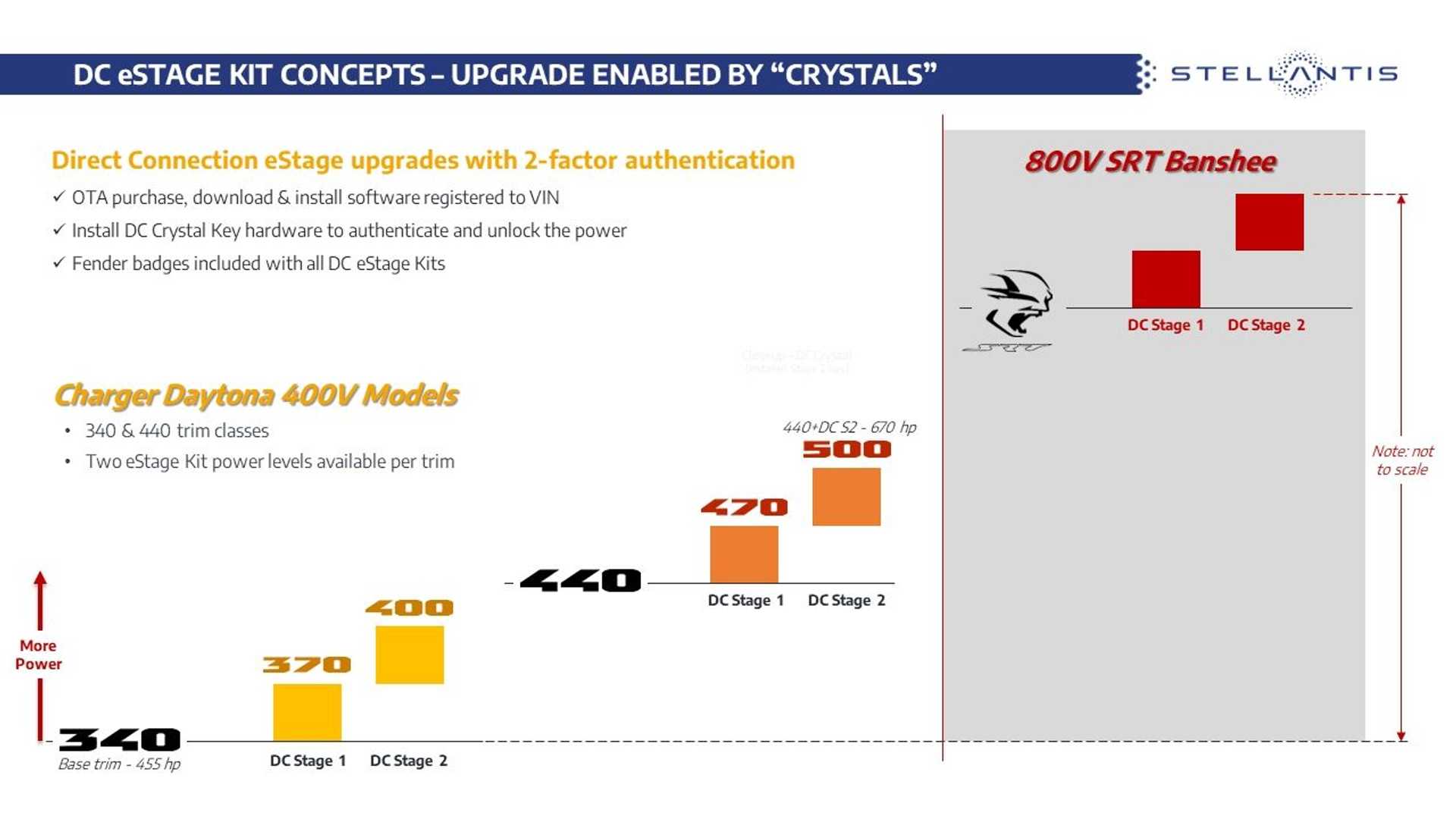Beyond the show car’s appearance, Dodge has revealed the output levels of the 400-volt version of the electric muscle car, with options between 455 horsepower (340 kilowatts), 495 hp (370 kW), 535 hp (400 kW), 590 hp (440 kW), 630 hp (470 kW), and 670 hp (500 kW). There will be three more outputs available for the top-spec 800-volt SRT Banshee models.