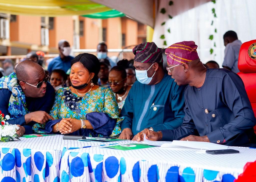 PIX 2627: Lagos State Governor, Mr. Babajide Sanwo-Olu (left behind) and  his deputy, Dr. Obafemi Hamzat (right behind) during the handover of compensation cheque to affected property owners of the Bola Ahmed Tinubu Road construction, during a working visit to Ikorodu Division at Ikorodu Town Hall, Ikorodu on Thursday, 10th of March, 2022.
