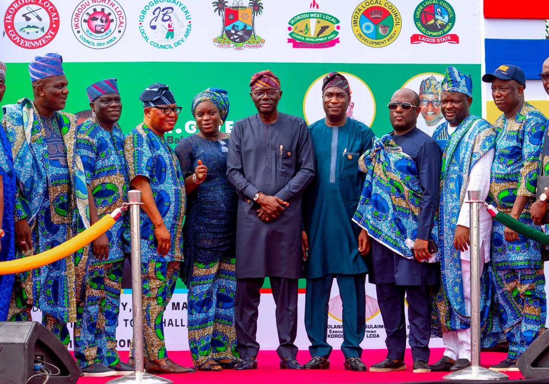 PIX 2649 L-R: Chairman, Ikorodu Local Government, Hon. Wasiu Adeshina; Chairman, Ikorodu West LCDA, Hon. Sulaimon Kazeem; Member, Lagos House of Assembly, Ikorodu Constituency II, Hon. Muyideen Solaja; Chairman, Ijede LCDA, Hon. Motunrayo Alogba; Lagos State Governor, Mr. Babajide Sanwo-Olu; his deputy, Dr. Obafemi Hamzat; Member, Federal House of Representatives, Ikorodu Constituency, Hon. Babajimi Benson; Chairman, Igbogbo-Baiyeku LCDA, Hon. Sesan Daini and Chairman, Imota LCDA, Hon. Wasiu Agoro, during the Governor’s working visit to Ikorodu Division at Ikorodu Town Hall, Ikorodu on Thursday, 10th of March, 2022.